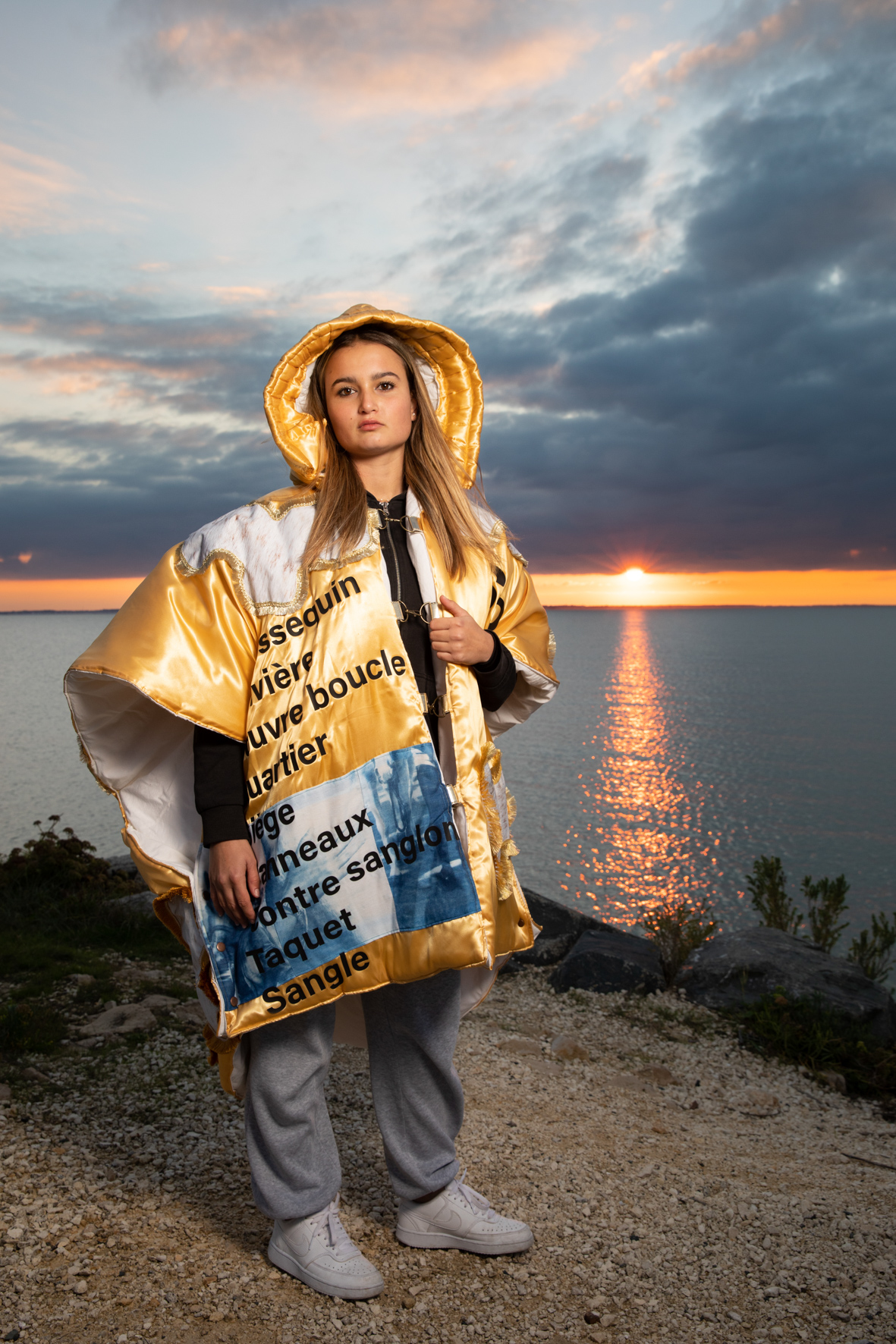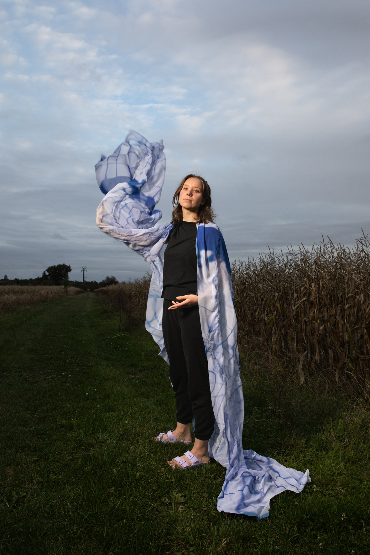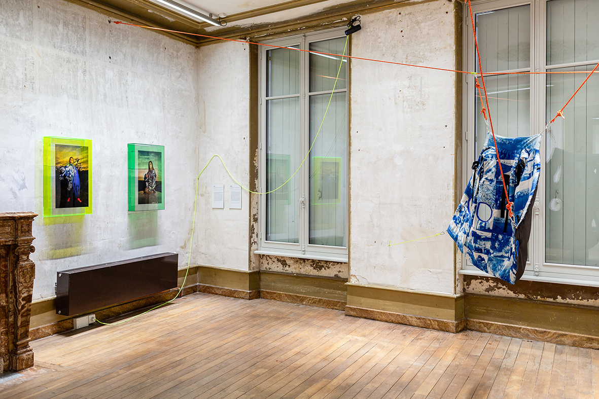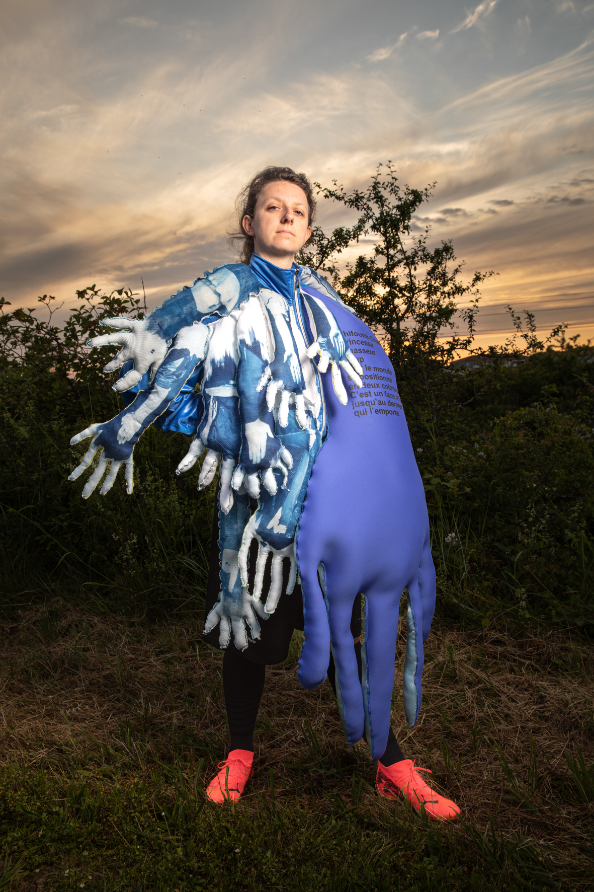 Pour chaque modèle, j’ai créé un vêtement-photographique unique à partir de tissus sur lesquels j’ai transféré nos discussions par des techniques photographiques telles que le cyanotype, l’impression jet d’encre... rendant visibles les émotions et les récits. Ces costumes, que viennent endosser les modèles, sont des surfaces vibrantes, un terrain où l’intime et le collectif se rejoignent, où le territoire de chacune prend corps dans une esthétique commune.