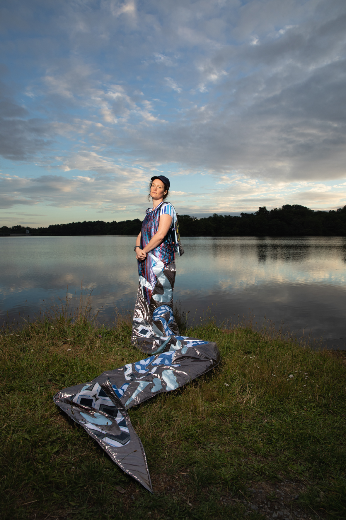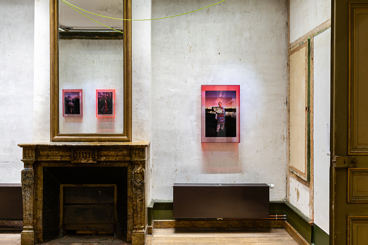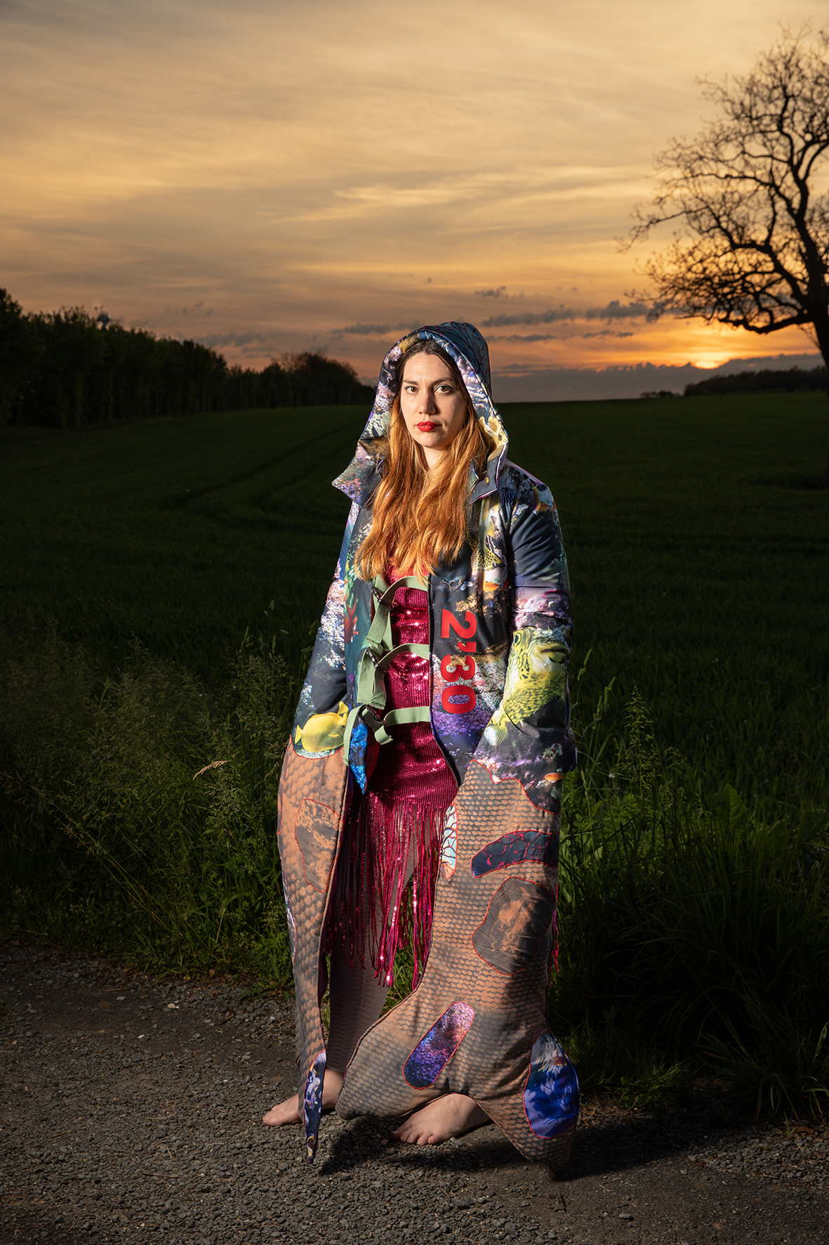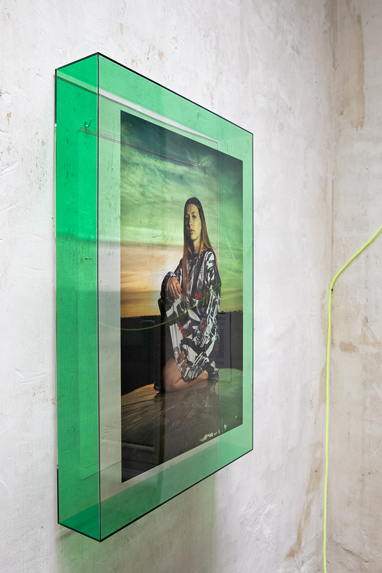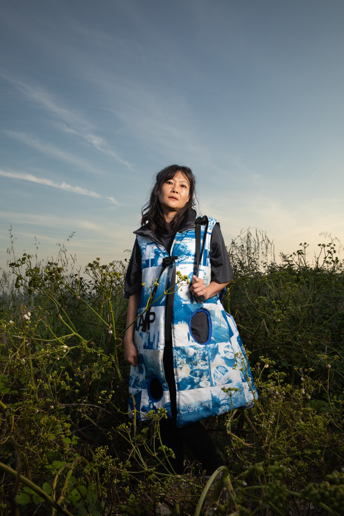 Pour chaque modèle, j’ai créé un vêtement-photographique unique à partir de tissus sur lesquels j’ai transféré nos discussions par des techniques photographiques telles que le cyanotype, l’impression jet d’encre... rendant visibles les émotions et les récits. Ces costumes, que viennent endosser les modèles, sont des surfaces vibrantes, un terrain où l’intime et le collectif se rejoignent, où le territoire de chacune prend corps dans une esthétique commune.