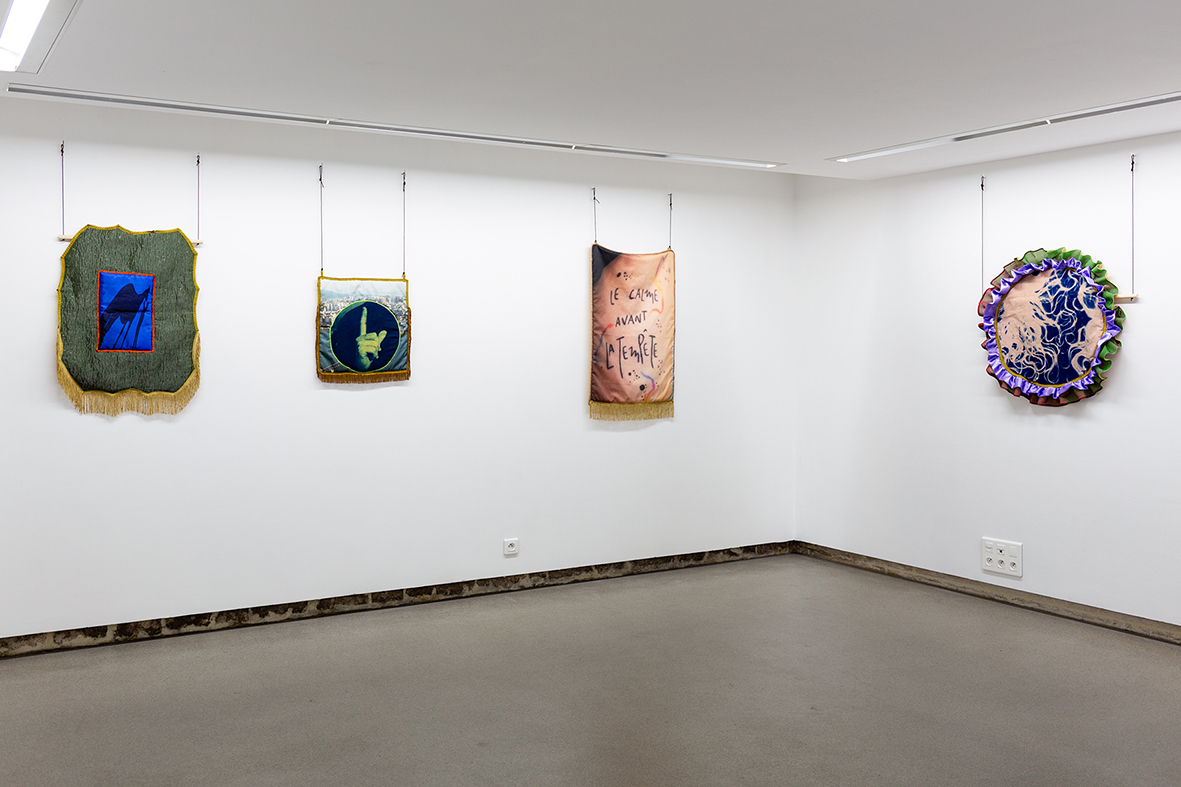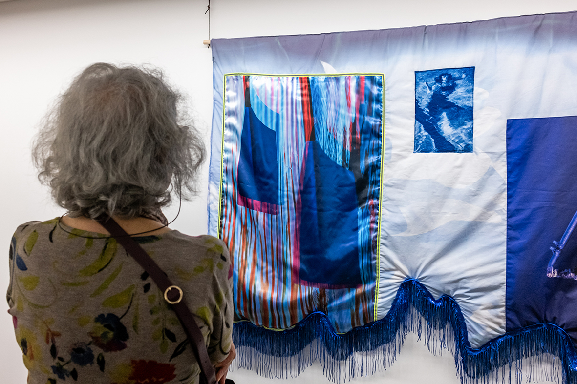 cyanotypes, impressions numériques, tissus, ouatine, satin, passementeries, rubans, franges