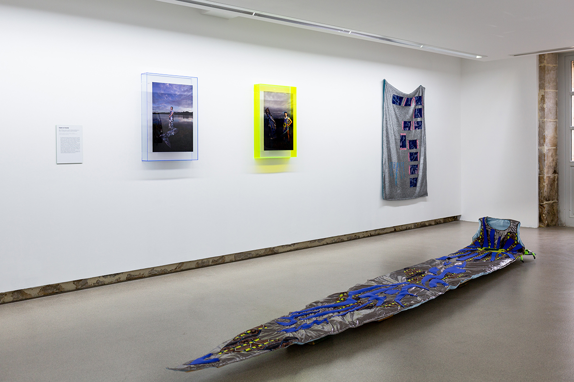 cyanotypes, impressions numériques, coton, polyester, tissus techniques, néoprène, feutre, lurex, ouatine, doublure satin, passementeries, sangles, rubans, scratch, flex